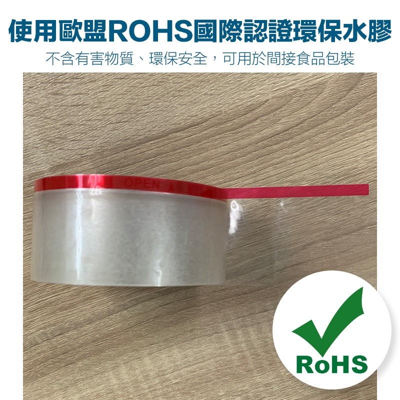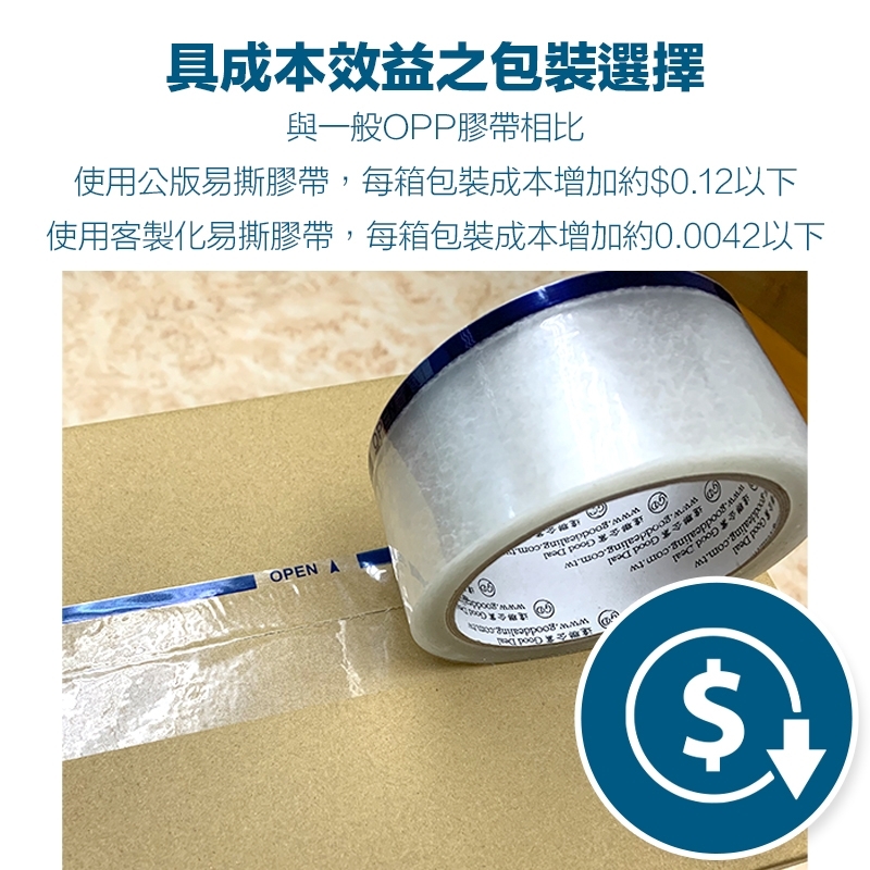安全:易撕膠帶使用水性壓克力環保水膠,環保安全。 經過歐盟ROHS國際認證,不含有害物質,環保水膠為美國FDA核可之高品質黏著劑,可用於間接食品包裝 開箱免刀割可直接撕除膠帶,避免內部物品損傷 不再需要用刀子開箱作業,可以完整保護箱內產品,可以免除工作人員受刀傷的機會,提升工作安全品質。 食品類包裝使用可避免汙染風險,用於冷藏食品包裝表現優異