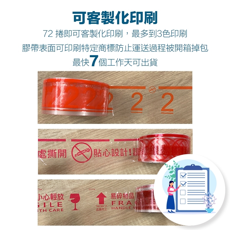 專案客製化: MOQ 最少72 捲即可客製化印刷,最多到3色印刷 確版後,12個工作天內可出貨 / 趕件加價7個工作天可出貨