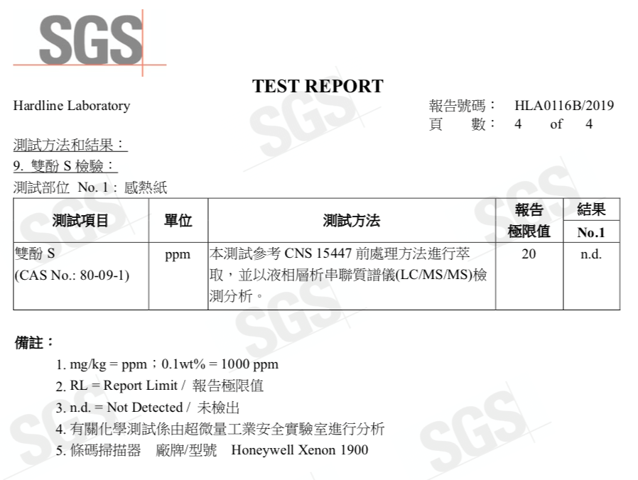 鈺植秉持企業社會責任,領先業界與政府要求標準,提供之電子發票感熱紙捲,通過SGS檢驗不含雙酚S。