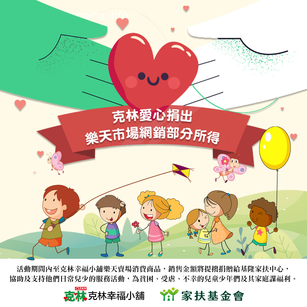 克林CLEAN 於網路樂天賣場, 經營眾多優質商品。 我們每月將捐出網銷部分所得給基隆家扶中心,