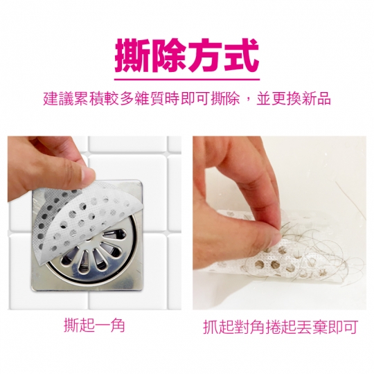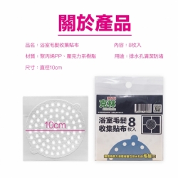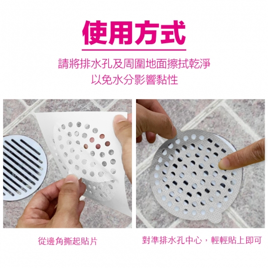 使用方式: 1.先將排水口及周邊擦拭乾淨 2.再將收集貼布對準排水孔中心,輕輕貼上即可