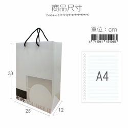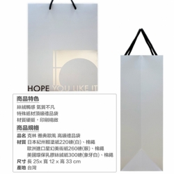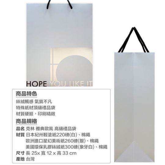 此款商品(象牙白)選用美國高級乳膠含浸觸感紙,手觸會有滑順肌膚的奢華感, 也由於乳膠含浸,因此比較容易留下手汗痕跡,介意者請勿選購! 品 名:『克林CLEAN』雅典歐風 高級禮品袋 規 格:長25cmx寬12cmx高33cm 材 質:日本紀州輕塗紙220磅(白)、棉繩 歐洲進口星幻美術紙260磅(銀)、棉繩 美國環保乳膠絲絨紙300磅(象牙白)、棉繩