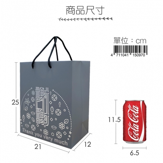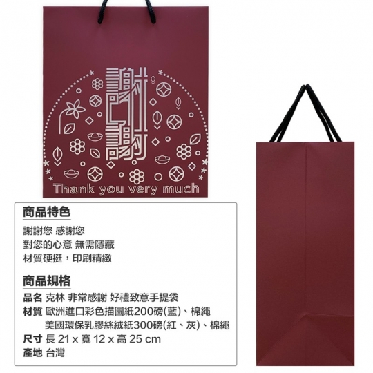 此款商品(灰色)選用美國高級乳膠含浸觸感紙,手觸會有滑順肌膚的奢華感, 也由於乳膠含浸,因此比較容易留下手汗痕跡,介意者請勿選購! 此款商品(藍色)為響應環保,製作過程完全沒有上膜,或含有任何塑膠材質保護袋體結構, 因此多次折疊使用後邊緣較易破損及產生尖銳的形象,需注意使用,介意者請勿選購! 品 名:『克林CLEAN』非常感謝 好禮致意手提袋 規 格:長21cmx寬12cmx高25cm 材 質:歐洲進口彩色描圖紙200磅(藍)、棉繩 /美國環保乳膠絲絨紙300磅(紅、灰)、棉繩